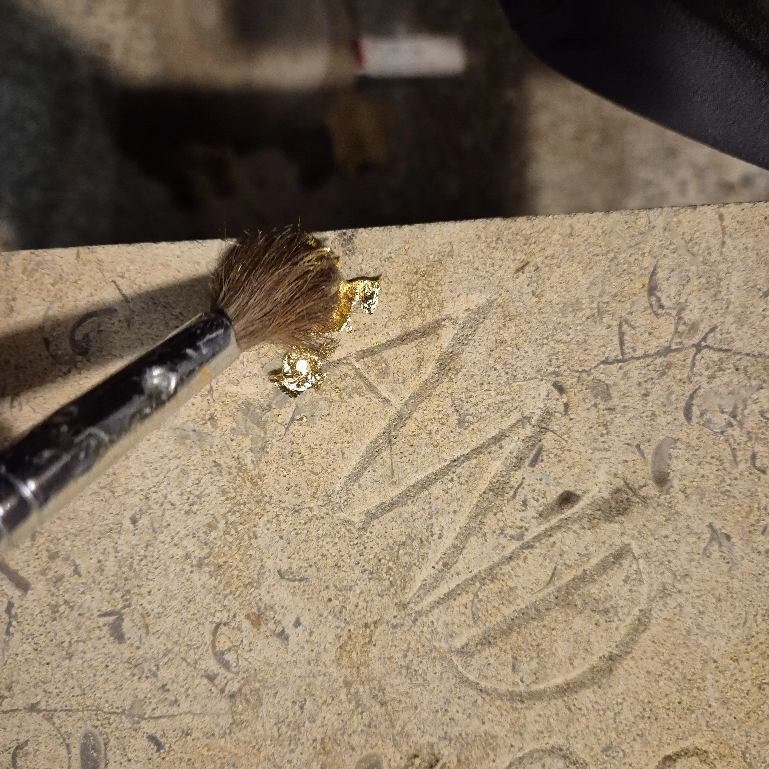 The little diamonds, being cut into the stone, needed to be made from loose leaf. This soft, floaty material would fit into the diamond cavities and ‘find’ the size. The top, plane surfaces could be made from transfer leaf, which is mounted on a waxed paper backing and much more easily pressed onto the size without loss.