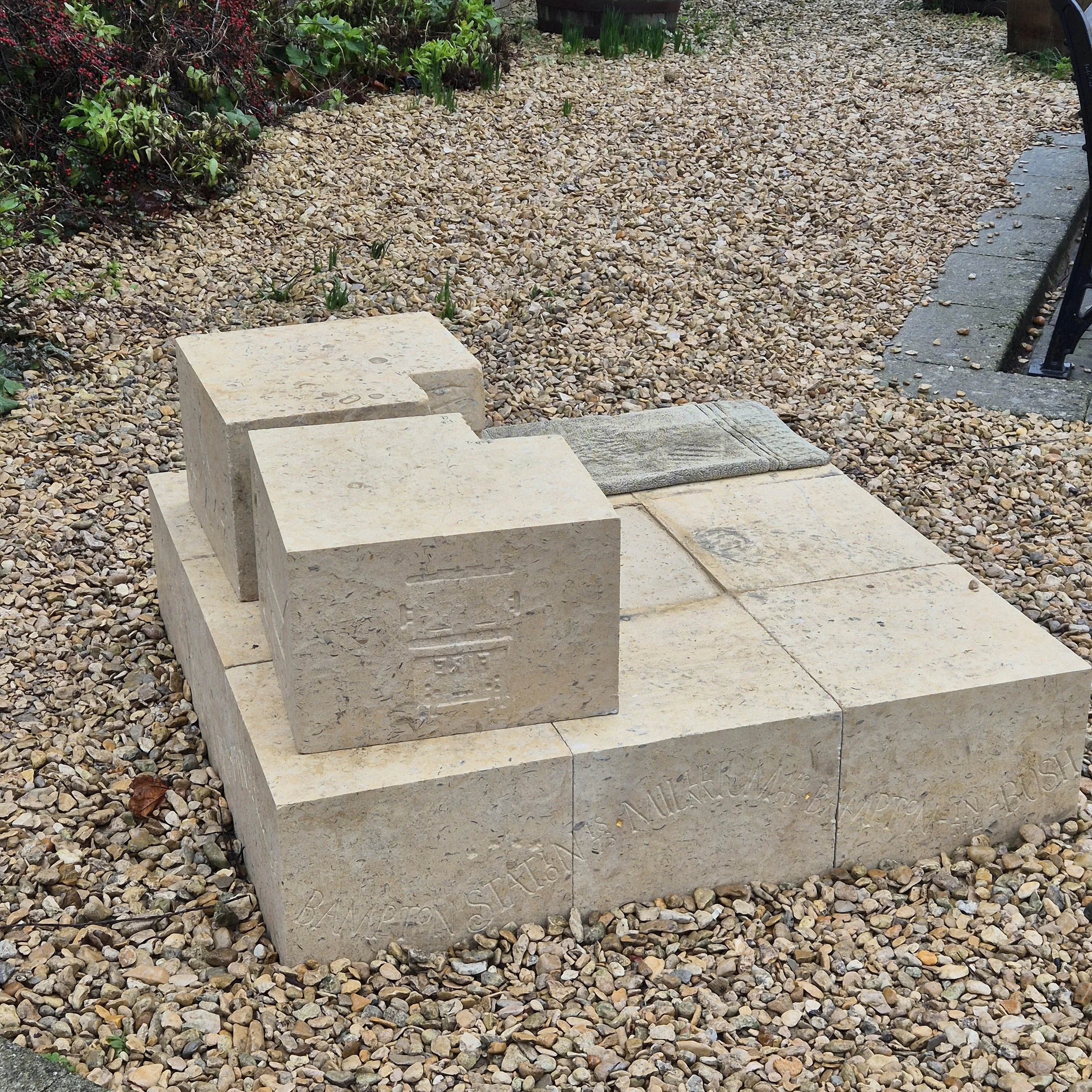 Above the text and below the Obelisk itself, I wanted a series of images that would reflect Bampton today. The Obelisk will have its morris dancers - but there’s so much more going on. I had, again, a great deal to select from, both the everyday and special moments within the year. I know that I missed out a great deal - I’m sorry if it’s your particular favourite! - but I tried to have a balance that would speak to everyone from the village in some part, and the image had to be something that could be represented effectively in carved stone. The images I decided on were: the Donkey Derby, that great day in August that brings in the children; Aunt Sally, played in the pubs with a league named for the village; the Shirt Race of course, represented as a pram and a pint which were the original must-haves; our fire station, honouring the work of those local men and women who give their time and risk their lives for our safety; the annual Remembrance Parade, so well attended, in memory of all those from the area who have served and given their lives over the years; sports clubs of Bampton including cricket, football, tennis and archery; a map of the central roads of the village and finally an image representing the dogs and dogwalkers of the village - of which I and my dogs are part. The four blocks making up this layer weigh in at about 80kg. Each will have a section cut out at the back to take the ‘keystone’ at the bottom of the obelisk itself, tieing the structure together.