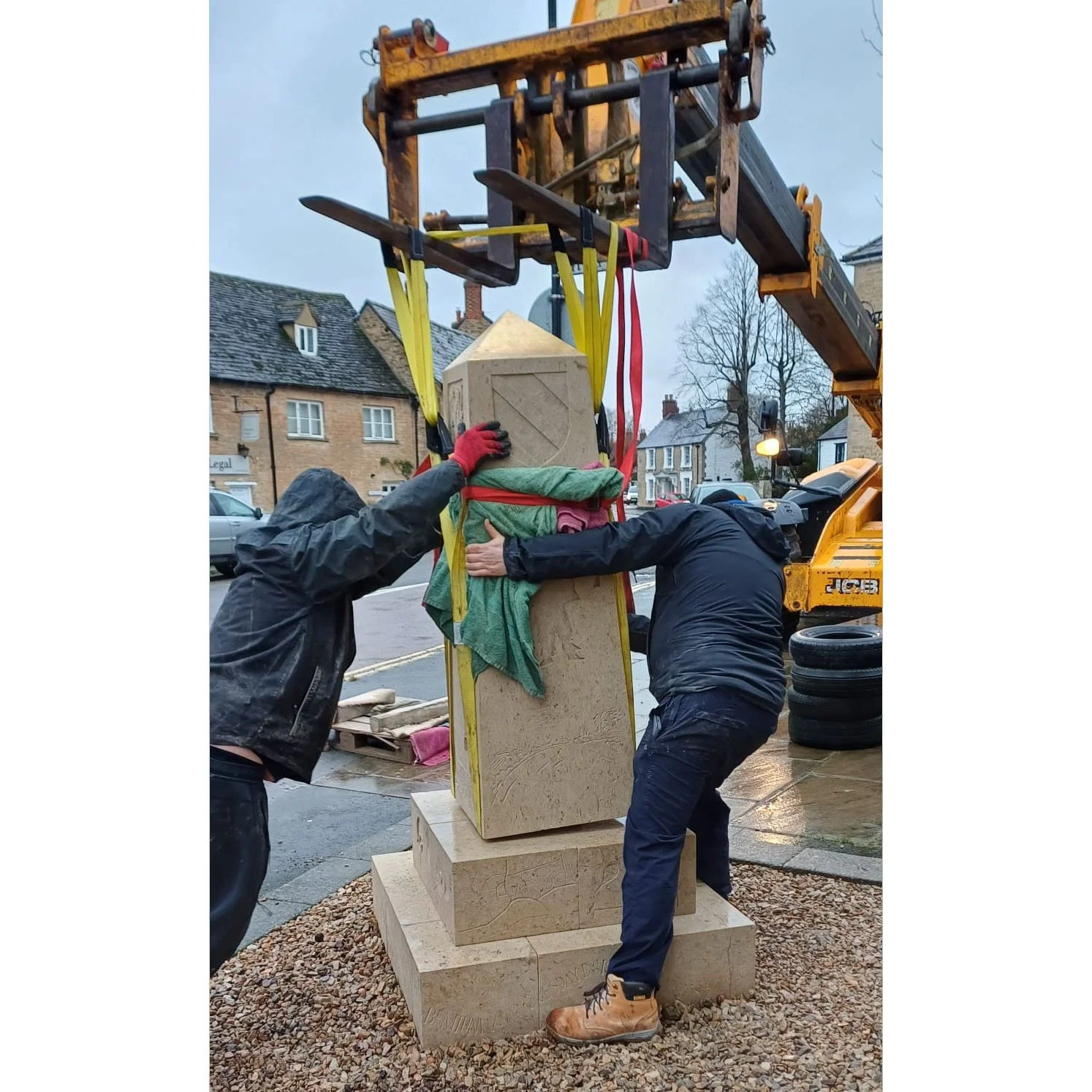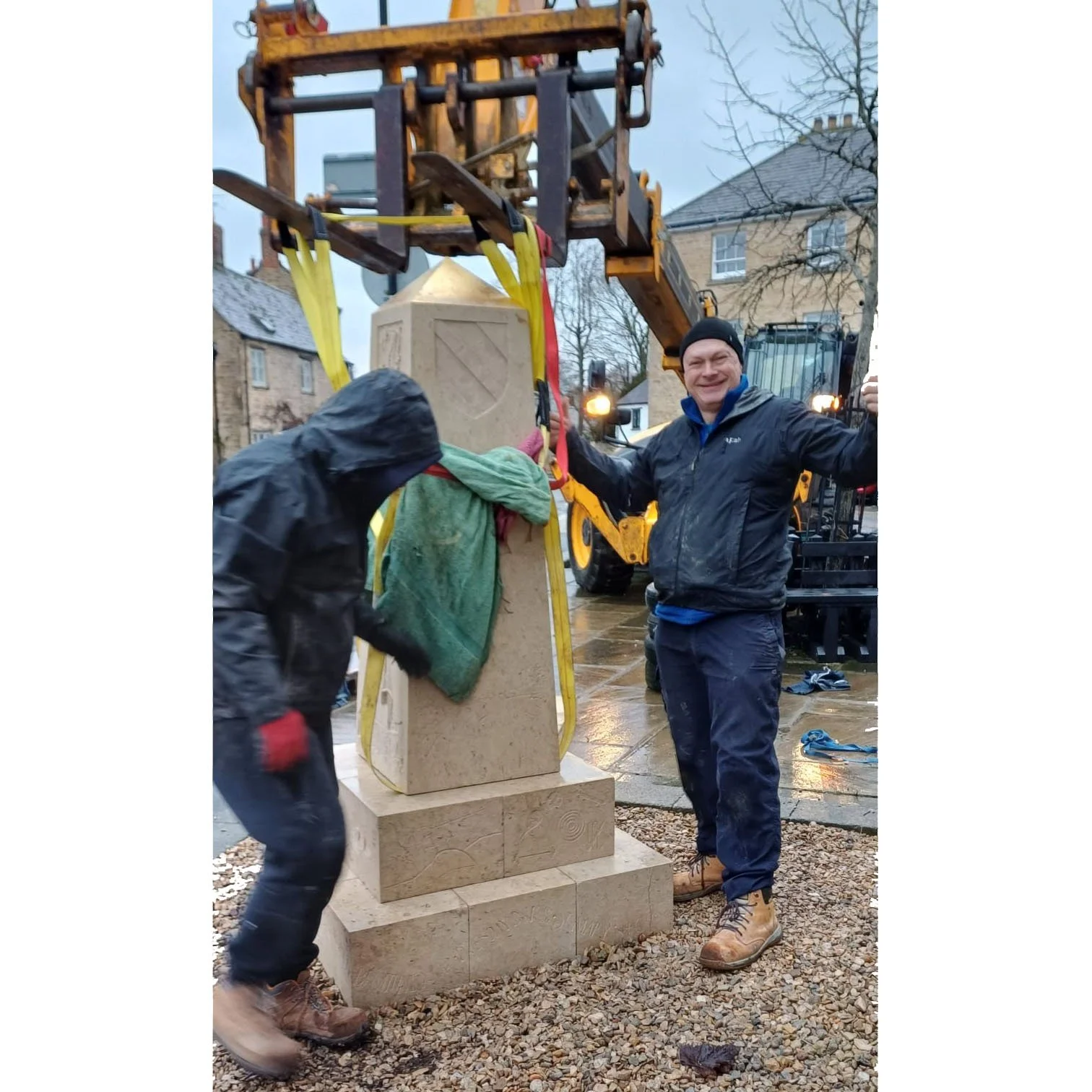The final instal, on Friday 23 January 2026, had been worrying me for a while, as neither I nor Millrick had ever done anything quite like this. The obelisk had been carved whilst it lay on its side on pallets, turning when each side was finished. At no stage had I seen it upright. All the technique was worked out on the fly, but we managed to use the large telehandler (a big fork lift) and lots of manual effort to get it off the trailer and standing on its foot, the stone keystone that would be inserted into the gap in the second layer. I had checked my measurements, and whilst it was tight, and it needed to be, all seemed in order. The delicate bit then involved lifting it vertically above the bases, and lowering it, aligning the keystone with the hole. There was about 2.5mm space on each side - it needed to be snug to be secure. With very careful control of the JCB and some pretty aggressive shoving at the heavy end, it slotted perfectly into place with a very pleasing ‘clunk’. It was done.